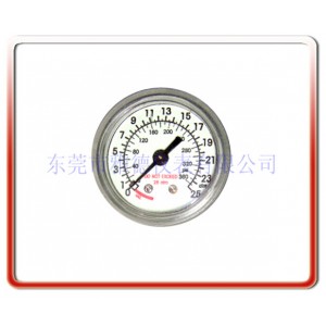 2. 表盘刻度外圏数字0~30bar,内圈数字0~400psi, 内外圈均用黑色,真空范围“0”以下用红色